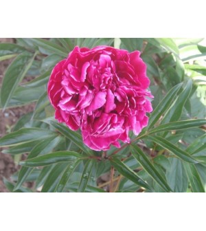 Grosse fleur double rouge intense montée sur une grande tige forte à bon feuillage.