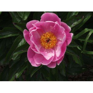 Pivoine japonaise simple rose foncé aux pétales argentés aux extrémités. Somptueux feuillage brun.